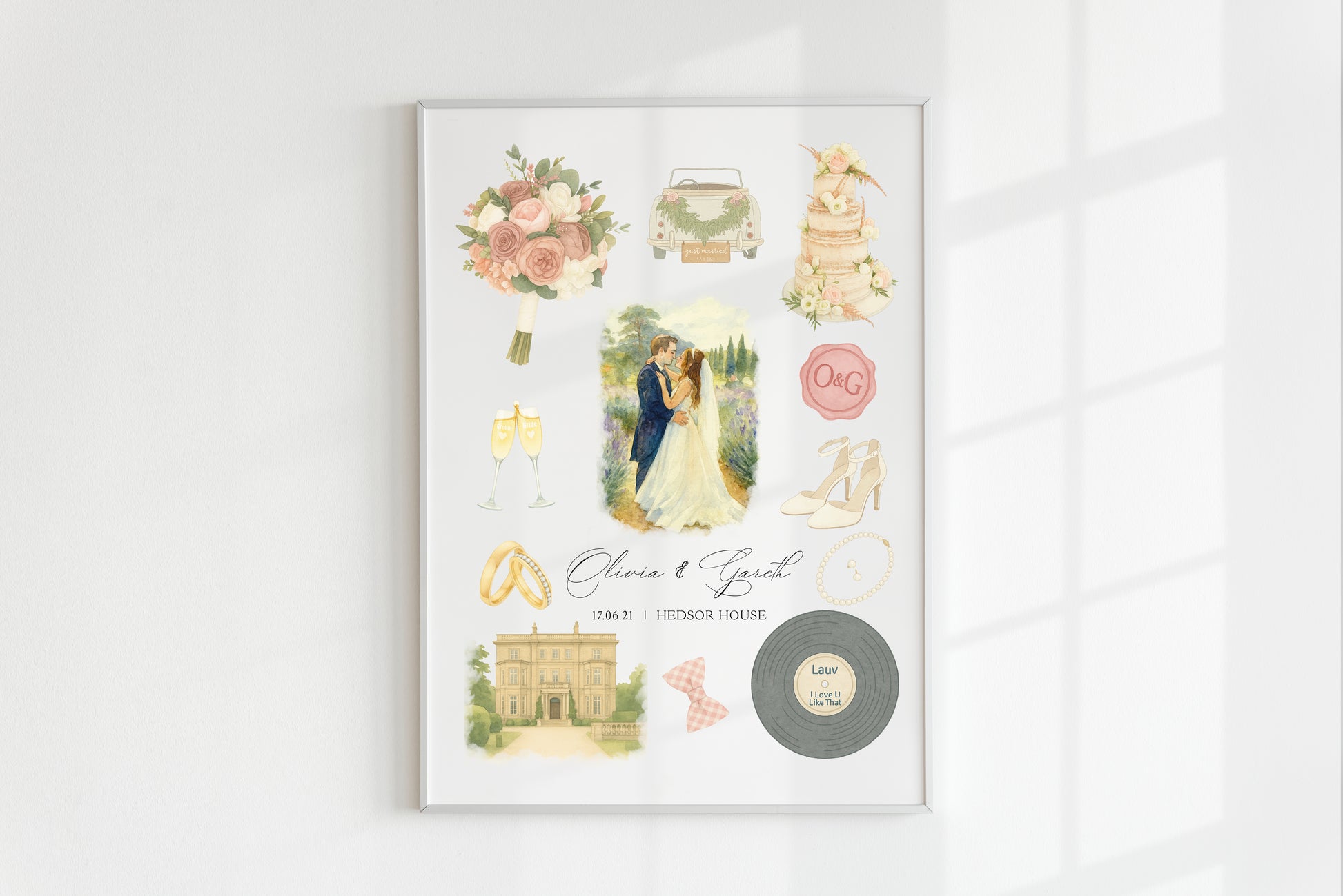 This digital watercolor painting captures up to 12 unique elements from your wedding day — think bouquet, wedding rings, venue, dress, cake, vows, and more. Each piece is hand-painted with care and combined into one high-resolution digital print or physical poster.